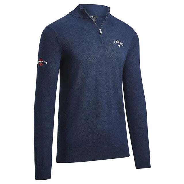 The Callaway Blended Merino sweater is a perfect companion for windy and chilly days out on the course. Designed to keep you warm and comfortable, it combines style, functionality, and various technologies that are designed with the golfer in mind. Crafted with thermal technology, this sweater is a game-changer in combating the cold. With 50% merino wool, it excels at trapping heat within its layers, providing the insulation you need to stay warm and focused on your game. With a white Callaway logo on the left chest and an Odyssey logo on the right sleeve, this sweater makes a great addition to your wardrobe.